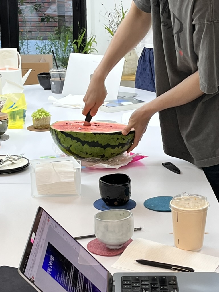 모임을 마친 직후, 버드콜 인근에 작업실을 둔 최유수 작가가 수박을 들고 나타났고, 그가 놀라운 손재간으로 깍뚝썰기를 한 수박을 모두 나눠먹었습니다.